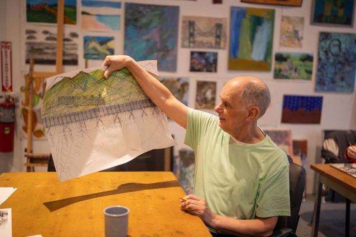 At the Maggie Daly Arts Cooperative (MDAC), John Mitchell III stands out as a gifted artist with an extraordinary talent for recreating places he’s visited—entirely from memory. His large-scale, detailed works capture the essence and scale of these locations with striking accuracy, blending creativity with an engineer’s precision.