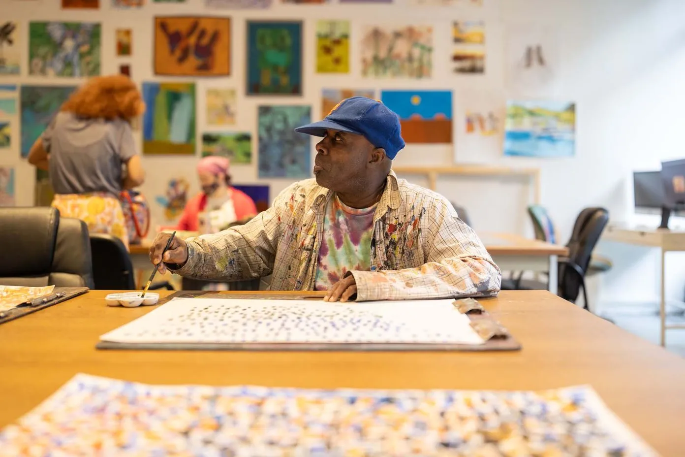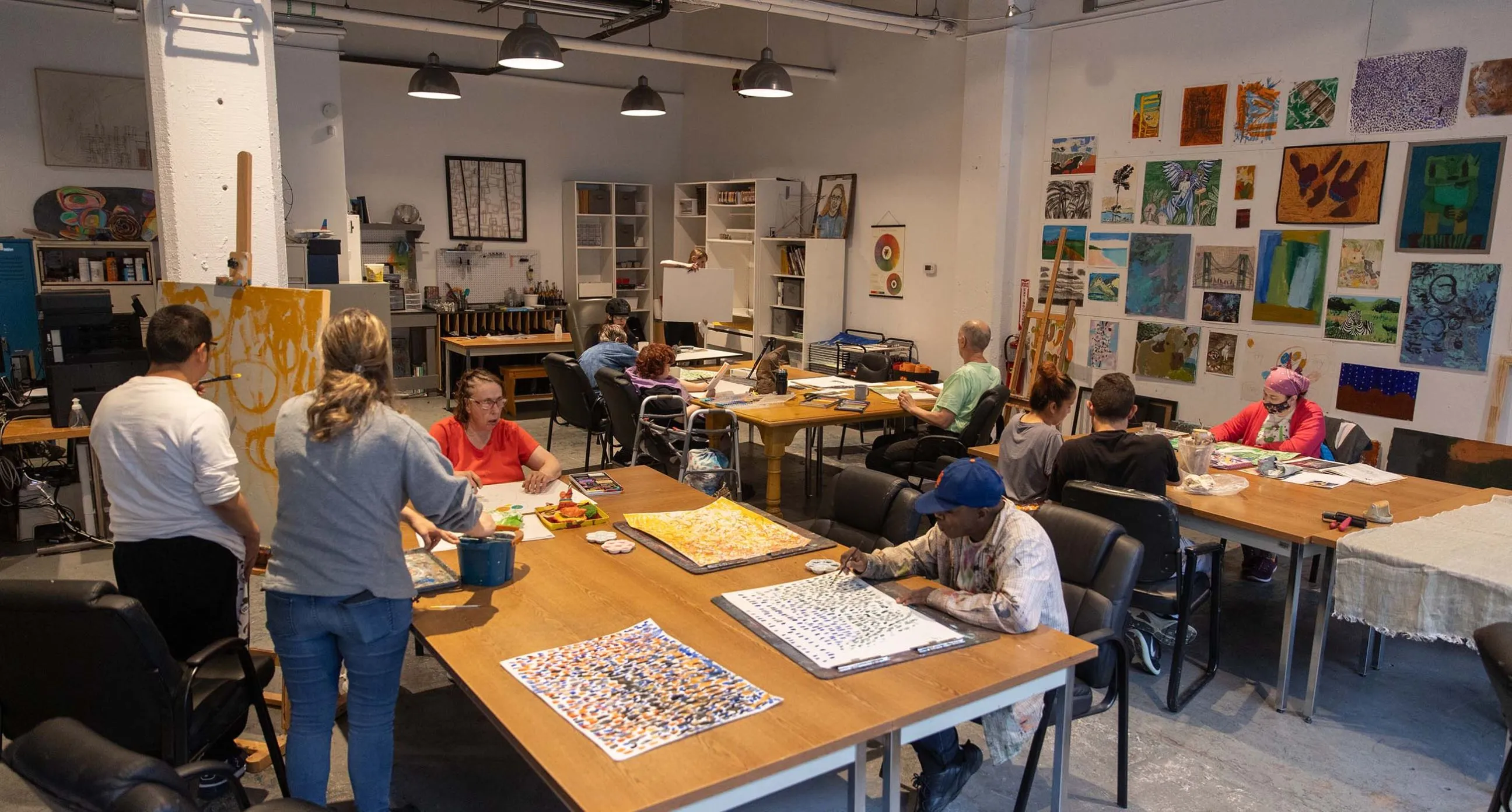MDAC Day Support programs provide a nurturing art space that serves as a true cooperative for creative exploration, offering participants the tools and support they need to express themselves as individuals and visual artists. With the freedom to experiment with diverse media and techniques, each participant’s unique artistic voice emerges, expressed through vivid color stories, textured surfaces, scale, and dynamic imagery. MDAC artists immerse themselves deeply in the process, discovering their creativity through intuition and experimentation.